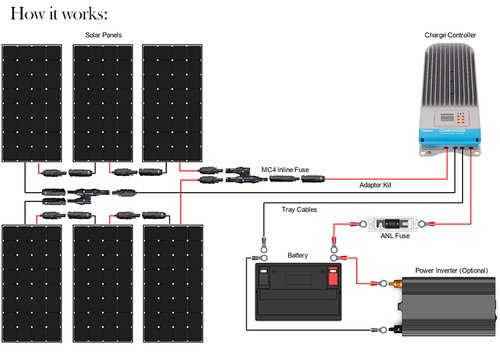Take command of the off-grid solar world with the Renogy 600 Watt 12V Premium Kit. Using our most efficient products we have put together a kit that can best suit your solar needs while on the go.Sleek design and a durable frame, the Renogy Premium 100 Watt 12 Volt Monocrystalline Panel provides you with the highest efficiency per area and is the perfect item for off-grid applications. The included Commander 60A MPPT Charge Controller features multiphase synchronous rectification and Maximum Power Point Tracking technologies, which increases charging efficiency. For convenience, this kit also consists of six sets of mounting Z-Brackets, branch connectors, one 20ft 10AWG MC4 Adaptor Kit, one 8ft 4AWG Tray Cable, and fusing components for protection of your controller and battery. This Premium Kit is perfect for installation on an RV, boat, or camper. It can also be installed in a ground mount system next to an off-grid campsite, making it an ideal choice for many off-grid applications. If you have any questions regarding this product, please call us at 1 (800) 330-8678 or email sales@renogy.com.